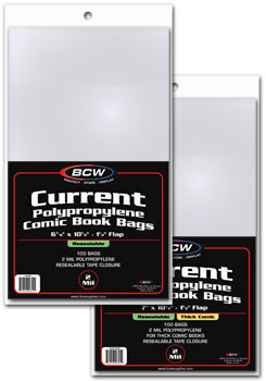 The BCW Resealable Current Age Comic Bags are an acid free, archival quality product made of crystal clear polypropylene. These bags have a reusable adhesive tape strip on the body of the bag so the collector can fold the top flap over and lock in the comic.